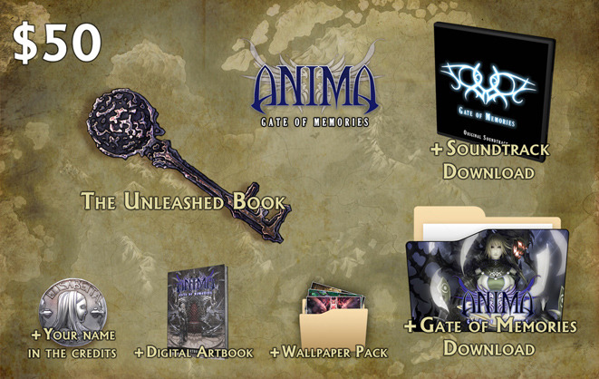 Art Poster When the game is released you will receive a poster featuring the main characters of Anima Gate of Memories. Domestic shipping is included, for international shipping add $10. Plus you will receive a free download of the game, the unleashed book code, the game soundtrack, the digital art book, your name will appear in the credits and you will get the HD computer wallpapers!