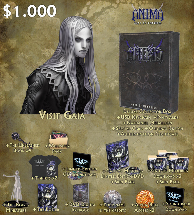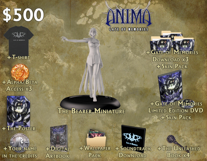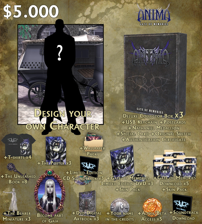 $5,000 Design Your Own Character (Limited to 2) You will get to collaborate on the design of a character that will be used in a prominent way in Anima Gate of Memories. On your election, this character may be also used in other Anima products, or future games. Plus, when the game is released, you will receive 3 legendary collector boxes, 5 free downloads of the game, each with their own unleashed book code and skin pack, 4 t-shirts, 3 art posters, the game soundtrack, your name will be used in Gaia, we will make a piece of art based on you, your name will appear in the credits, and you will get the HD computer wallpapers! Domestic shipping is included, for international shipping add $10.
